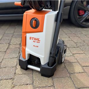 What is it? If you regularly wash your car at home, or even if you only need to clean the patio or decking once a year, having a decent pressure washer makes all the difference. The Stihl RE 120 Plus is one of Stihl's mid range pressure washers and is fitted with a brushless induction motor and an aluminium pump which delivers 125 bar of pressure. It features an extendable aluminium telescopic handle plus a folding side storage compartment...