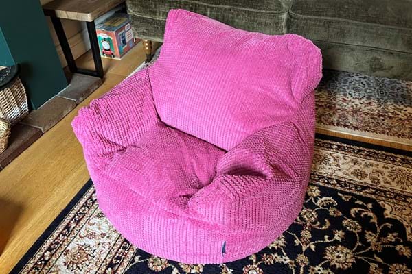 The Children's Armchair bean bag is available in various colours including the pink we're testing here and there are two finishes, either cord or the pom pom we've gone for. It measures 50cm by 50cm and comes with SupremeX polystyrene filling and a child safety zip to stop little hands getting to the filling. It also has a stain resistant finish and is fire retardant plus there's a two year guarantee.