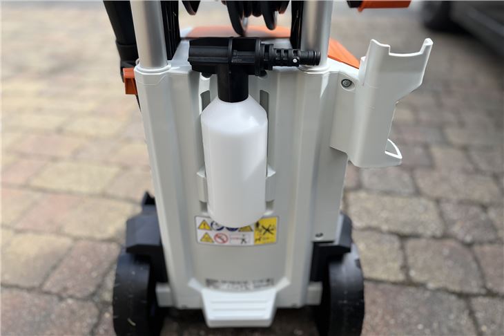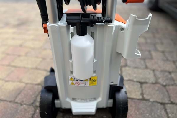 Like all Stihl products, the RE 120 Plus feels high quality and made to last. At more than 20kg, it's hardly light, as you'd expect, but the sturdy telescopic handle makes it easy to manouevre in the right place. Setting it up is easy too, the power lead is neatly stored in a side compartment (where you can also keep the spare nozzle) while the lance simply clicks into the quick release hose fitting. Connect your hose and you're ready to go.