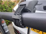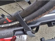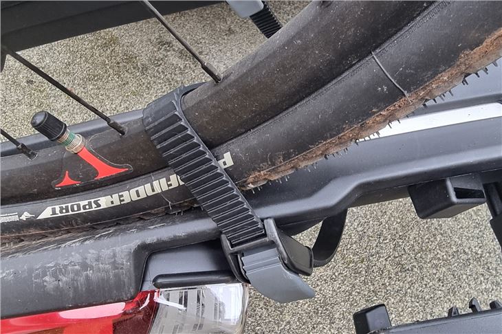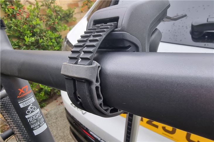 The locking head on the top of the telescopic arm features a strap with a compression section on the inside part to help protect your frame when you tighten up the strap - this is done via a ratchet system and means you really make sure your bike's properly secured. You can then lock this in place if you're going to be leaving your car unattended before securing the wheels via the wheel straps. You're then ready to go.