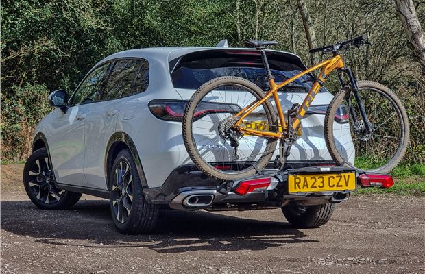 But what if you've loaded up the bikes and still have stuff to pop in the boot? The Thule Epos has a tilting mechanism. You push down on the central foot pedal and the whole rack, bikes included, tilts forward. You can then easily open and close the boot before pushing the rack back in place - there's a reassuring click so you know it's locked in place and isn't going to fly backwards as you pull off your drive.